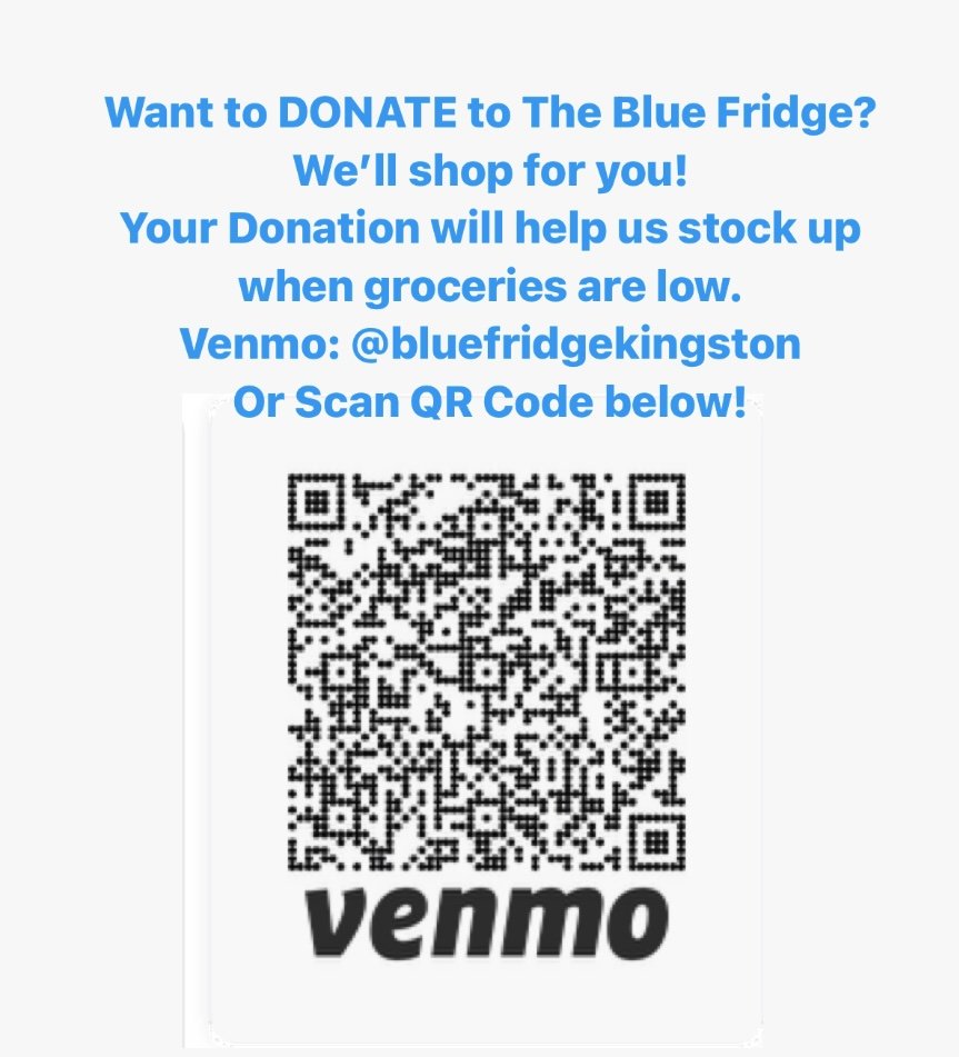 Leave Food Donations in the Blue Fridge whenever it’s open.